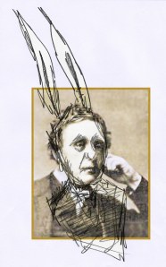 My starting point became the relationship between Lewis Carroll and Alice Liddell. I started to use photographs of Carroll’s face as a base for the characters in Wonderland. So the White Rabbit leading Alice from her sister’s side, becomes a symbol for Carroll himself. And then glimpses of a distorted Carroll appear again, creeping through in the other characters. These are set against a grumpy, frowning Alice.