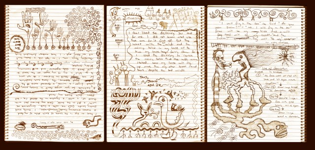 Drawing for other people has meant that my own ideas and clumps of imagination have had to spring out in unusual places. When I have been waiting for things or on the phone for long periods or just feeling playful in the gaps between one task and the next, I have scribbled little drawings in the margins of notepads, on scraps of paper or around pre-existing sketches. Some of these drawings are conscious attempts to plan things or work something out but most of them just seem to spill out as absent minded doodles and I’m happy they have a place to go. Each of these pages or scraps of paper becomes like a Petri dish festering with ideas, scribbles mutating into more scribbles. I’ve found I’ve produced a lot of these drawings at writing classes, between writing tasks, and it’s as if the engine of my mind needs to be kept ticking over with drawings between outbursts of words; which has made me think a lot about the relationship between my words and pictures and how I would like to develop that. There’s an interesting collection of ‘idle doodles from famous authors’ here http://www.flavorwire.com/147177/idle-doodles-by-famous-authors