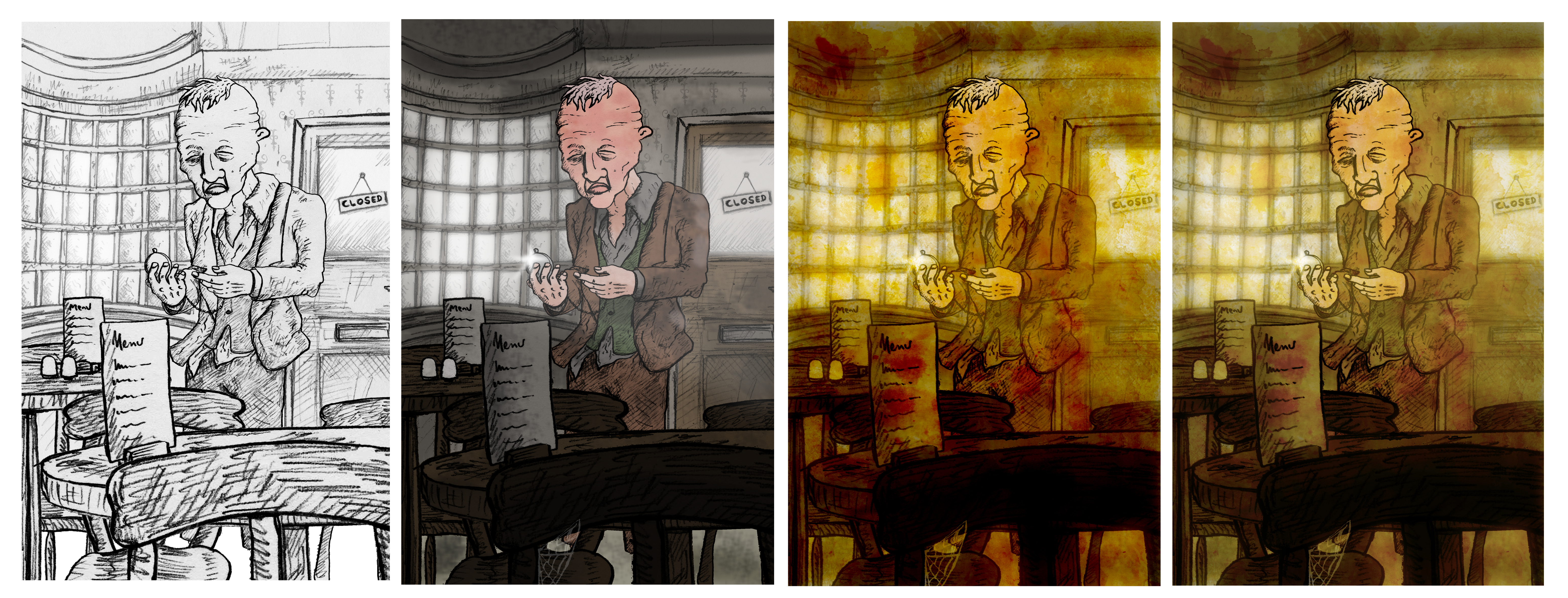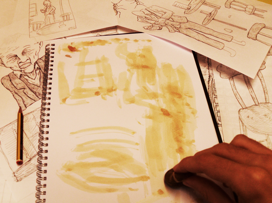 Because it’s a story that features so much tea and cake, and a run down cafe with its disheveled proprietor, Les Crumple, we thought we’d make use of tea stain textures throughout the illustrations. This has meant I’ve had quite a lot of fun rolling teabags across paper and squeezing them to drip and splatter across the page. The images below show something of the process – with the tea texture layer being created separately from the drawings and blended with the colour image (of Les in his cafe) at the end. I like tea.