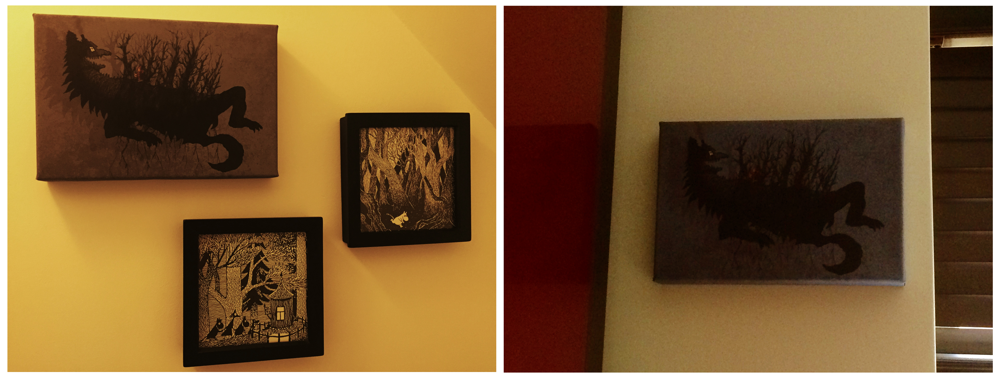 So a few years ago I attended a Myths & Fairy Tales course in creative writing (at Evolution Arts) with the idea of developing my storytelling skills. I enjoyed the writing but I also couldn’t resist responding to each of the sessions with some little sketches too. From the Red Riding Hood session I created a series of drawings that became the ‘Wolf Woods’ image below. The course tutor, Wendy, suggested they use the image in the course brochure and from there people have seen it and contacted me for canvas prints to put on their walls. It’s exciting that doodles on the margins of a notepad can go on such a journey!