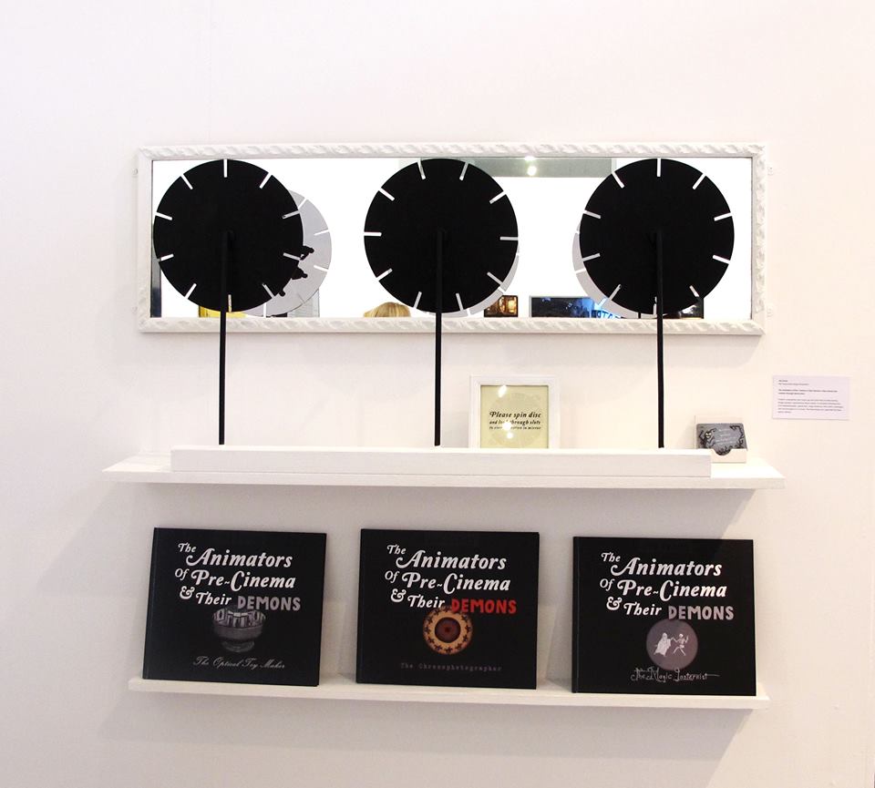 Below are some images of my space in the exhibition: three phenakistiscope optical toys with looping animations (viewed in mirror through slots of disc when spun) that relate to each of the three graphic biographies on the shelf below them. Also below, the rough digital test versions of the looping animations.